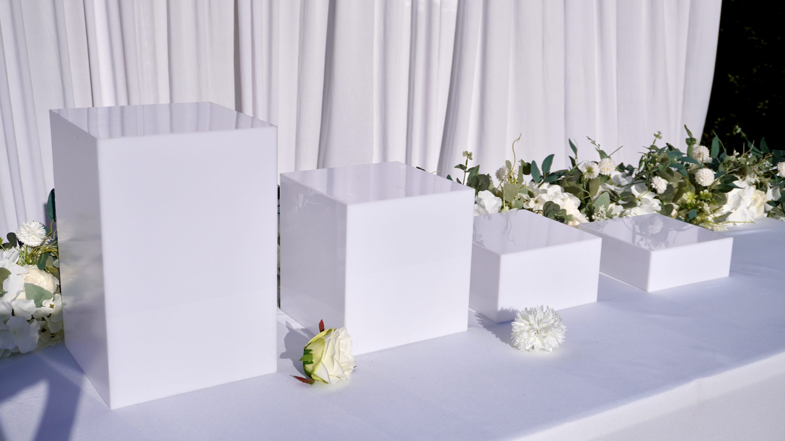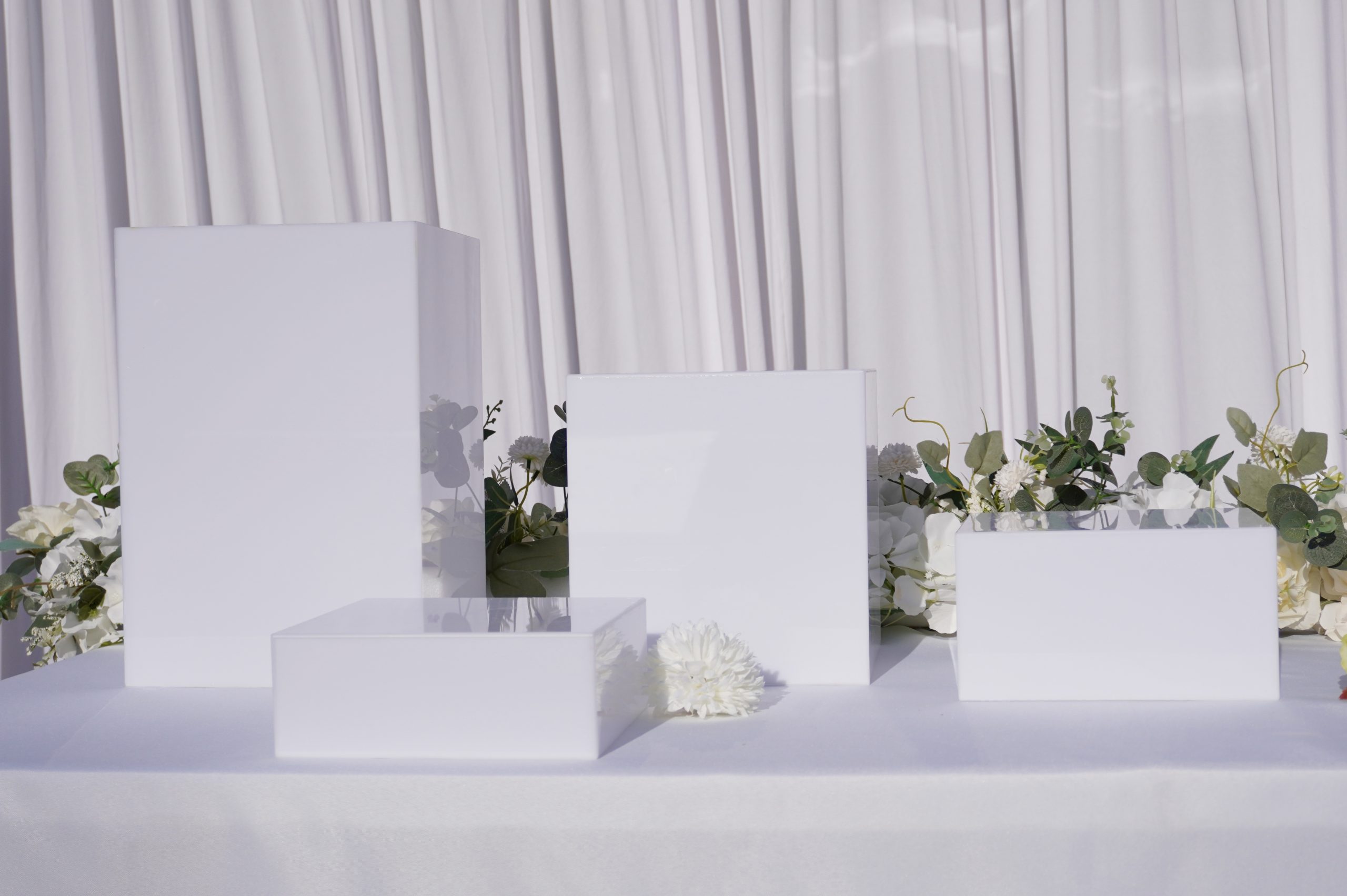 Parfait pour sublimer vos buffets, ce lot de 4 cubes en plexiglas blanc de différentes tailles apporte une touche moderne et élégante à vos présentations :